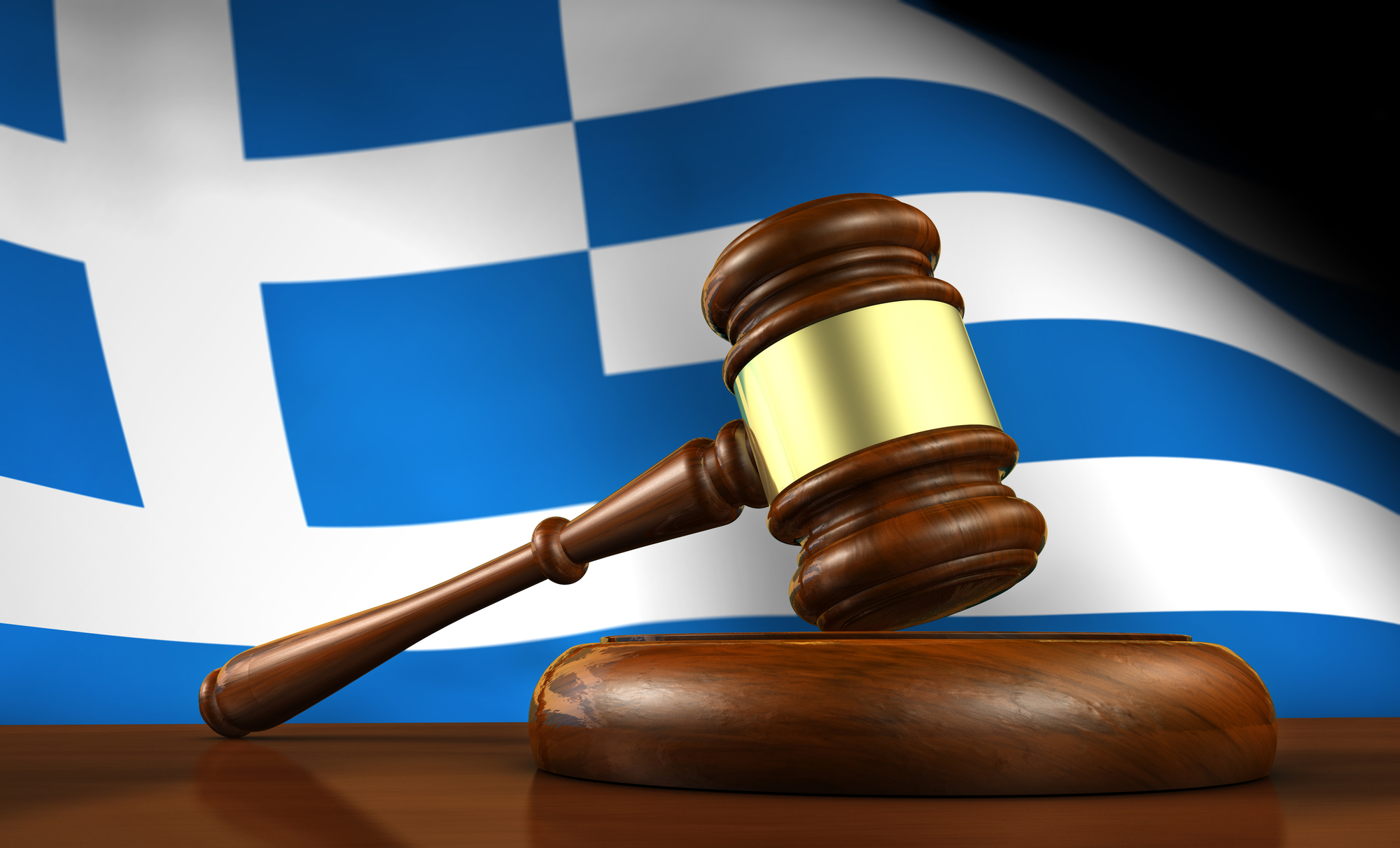 Law and justice of Greece concept with a 3d rendering of a gavel on a wooden desktop and the Greek flag on background.[/caption]